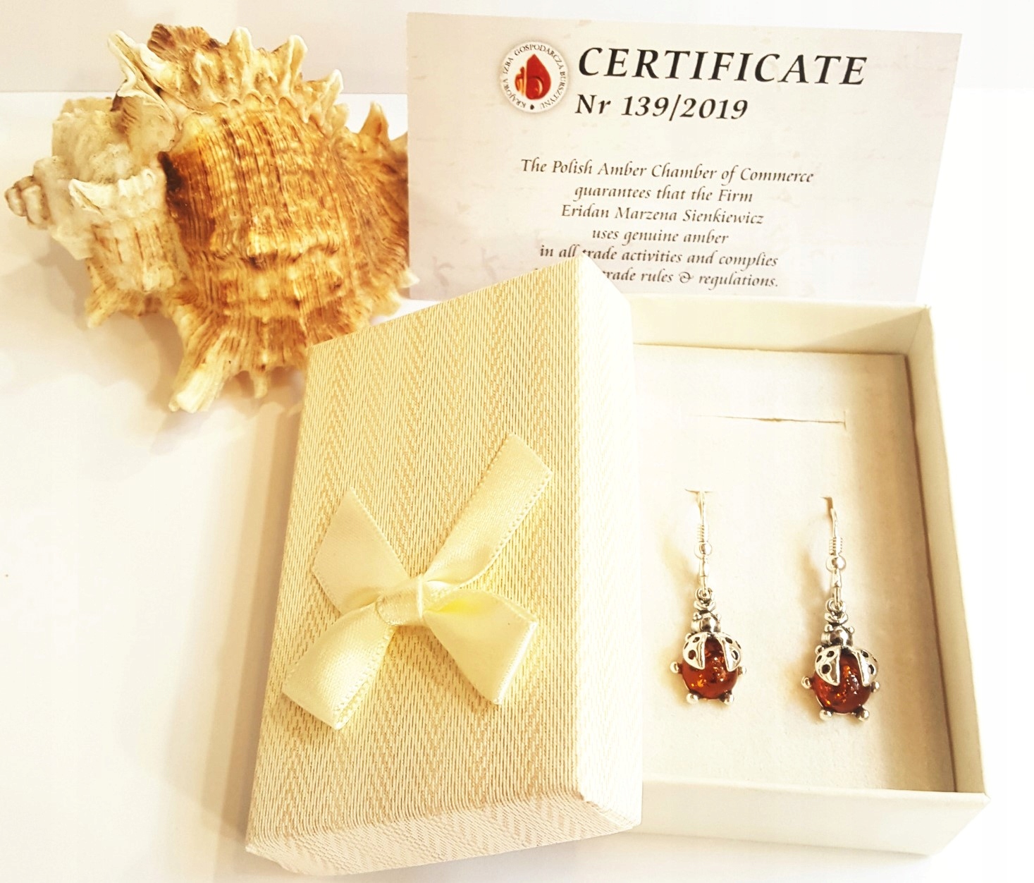 KOLCZYKI SREBRO 925 BURSZTYN biedronki + certyf.