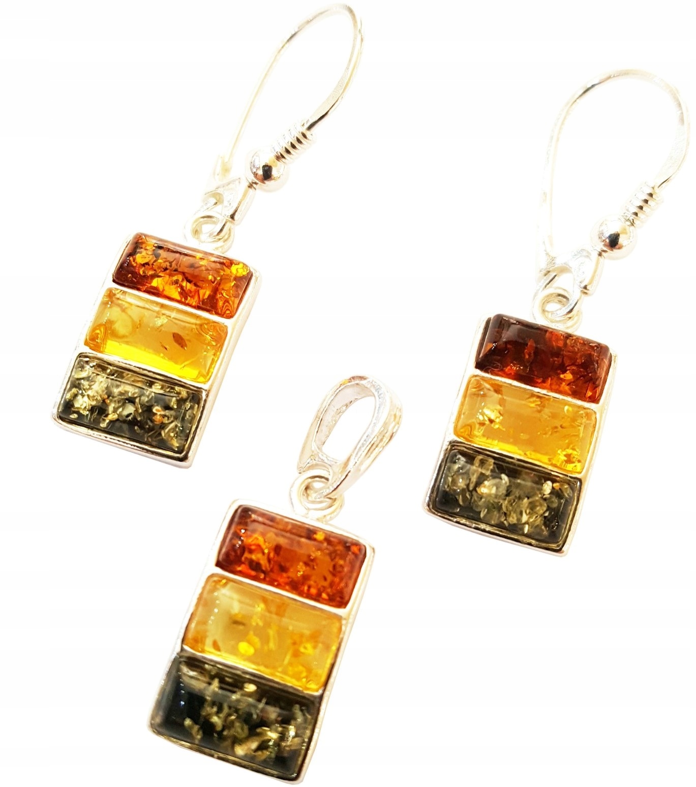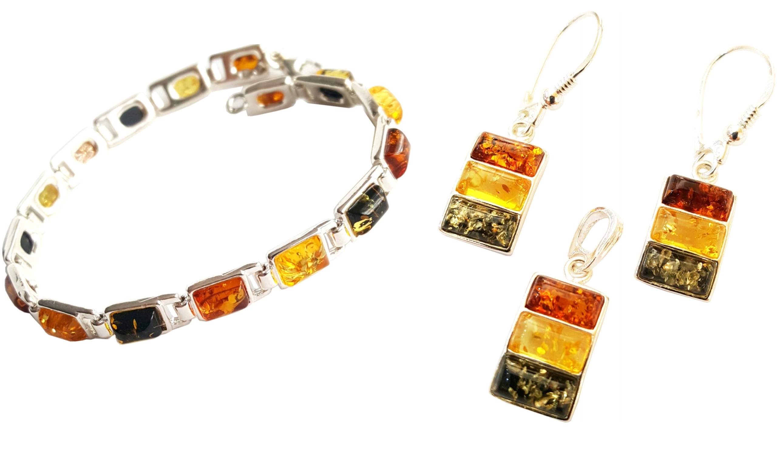 KOMPLET srebrny z bursztynem – KOLCZYKI + WISIOREK + BRANSOLETKA Prawdziwy BURSZTYN (wielokolorowy) SREBRO 925