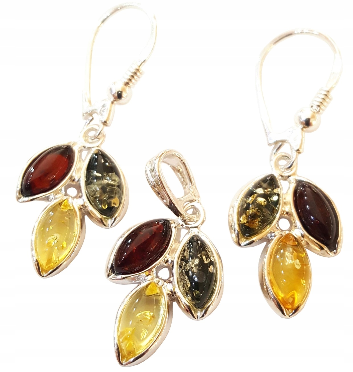 Mega KOMPLET srebrny z bursztynem – KOLCZYKI + ZAWIESZKA + BRANSOLETKA Prawdziwy BURSZTYN (wielokolorowy) SREBRO 925
