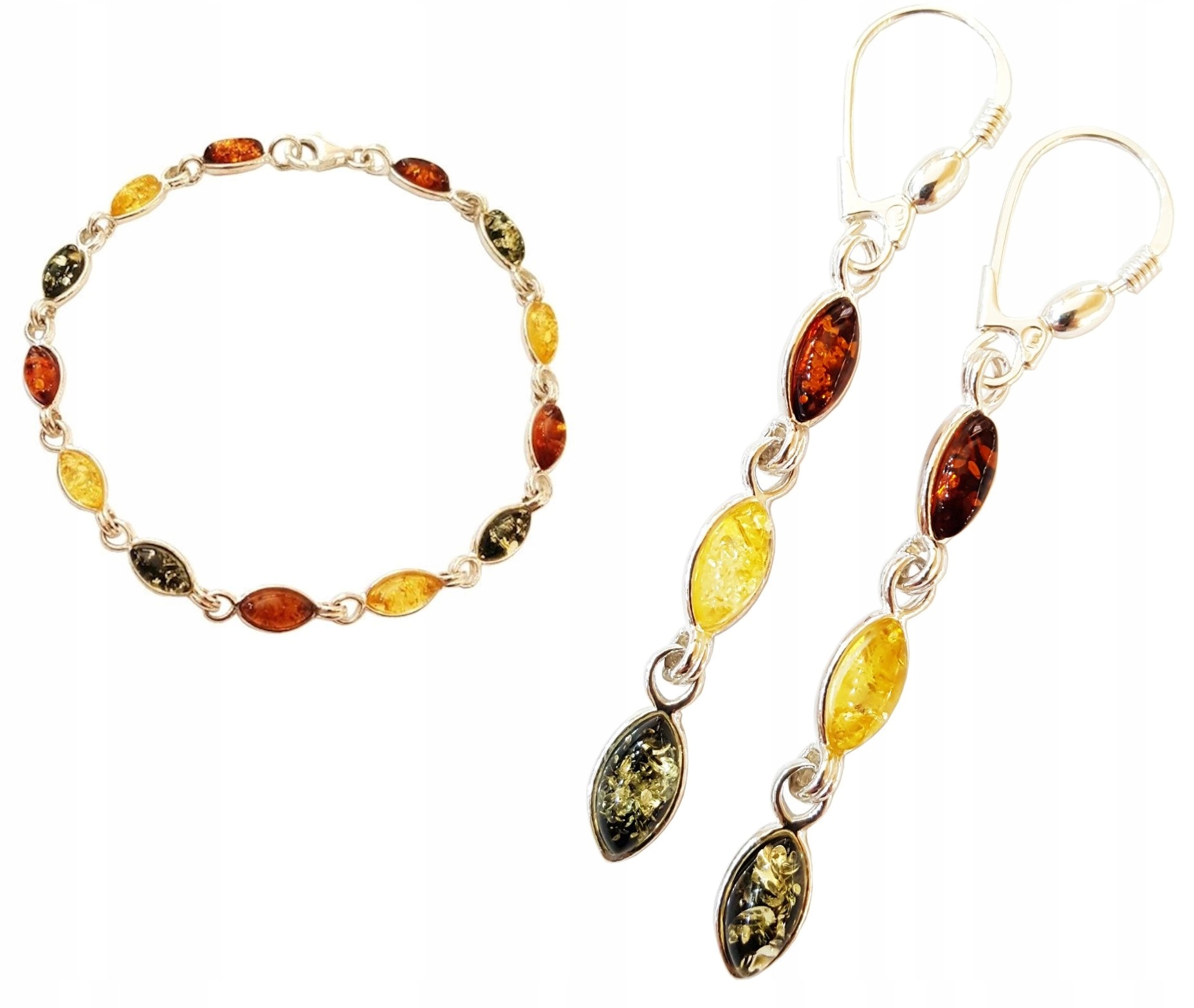 Mega KOMPLET srebrny z bursztynem – długie KOLCZYKI + BRANSOLETKA Prawdziwy BURSZTYN (wielokolorowy) SREBRO 925