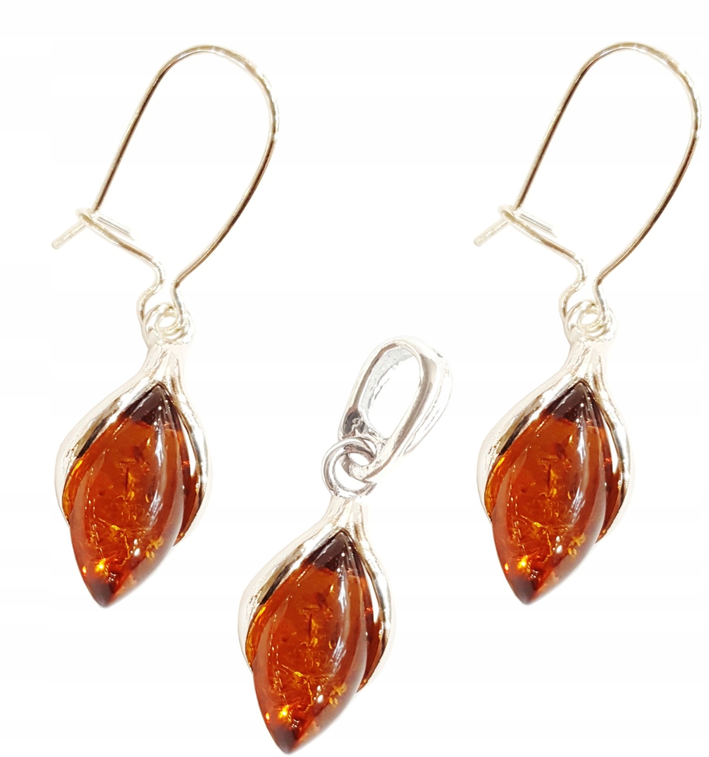 Oferujemy Państwu wyjątkowy KOMPLET srebrny z bursztynem – KOLCZYKI + WISIOREK.