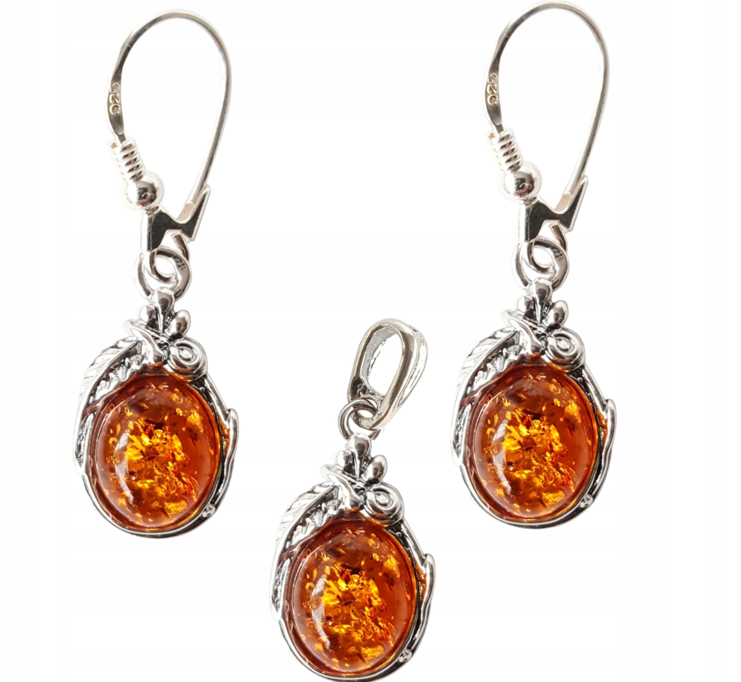 Oferujemy Państwu wyjątkowy KOMPLET srebrny z bursztynem – KOLCZYKI + WISIOREK.