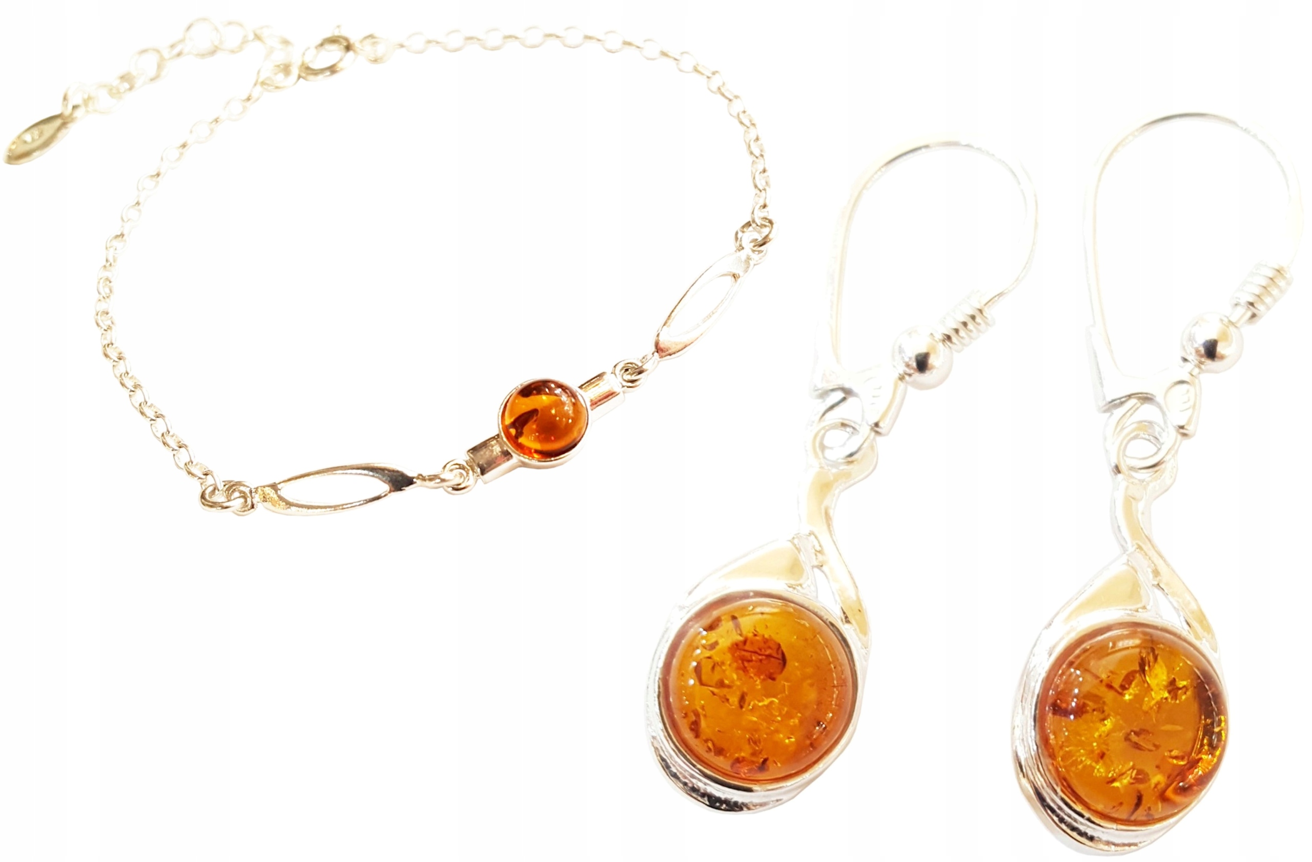 Oferujemy Państwu wyjątkowy KOMPLET srebrny z bursztynem – KOLCZYKI + BRANSOLETKA (kolor BRĄZOWY).