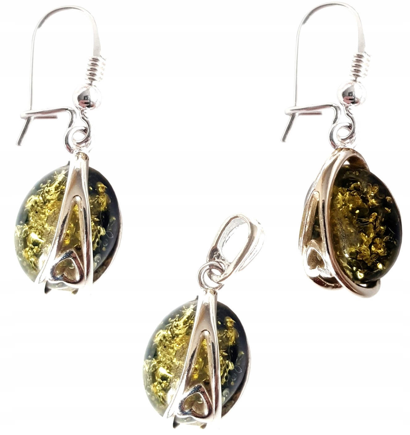 Oferujemy Państwu wyjątkowy KOMPLET srebrny z bursztynem – KOLCZYKI + WISIOREK.