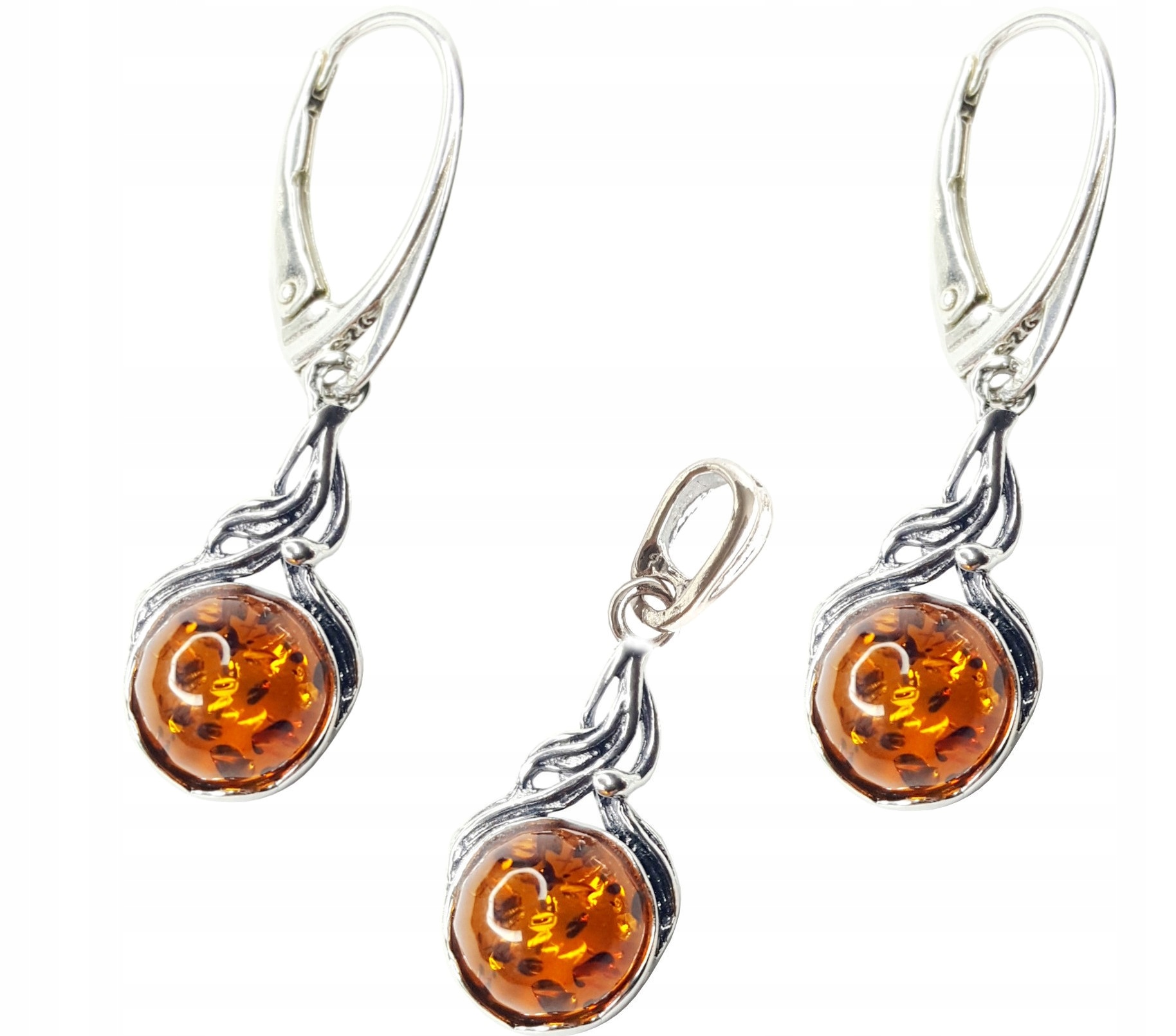 Oferujemy Państwu wyjątkowy KOMPLET srebrny z bursztynem – KOLCZYKI + ZAWIESZKA.