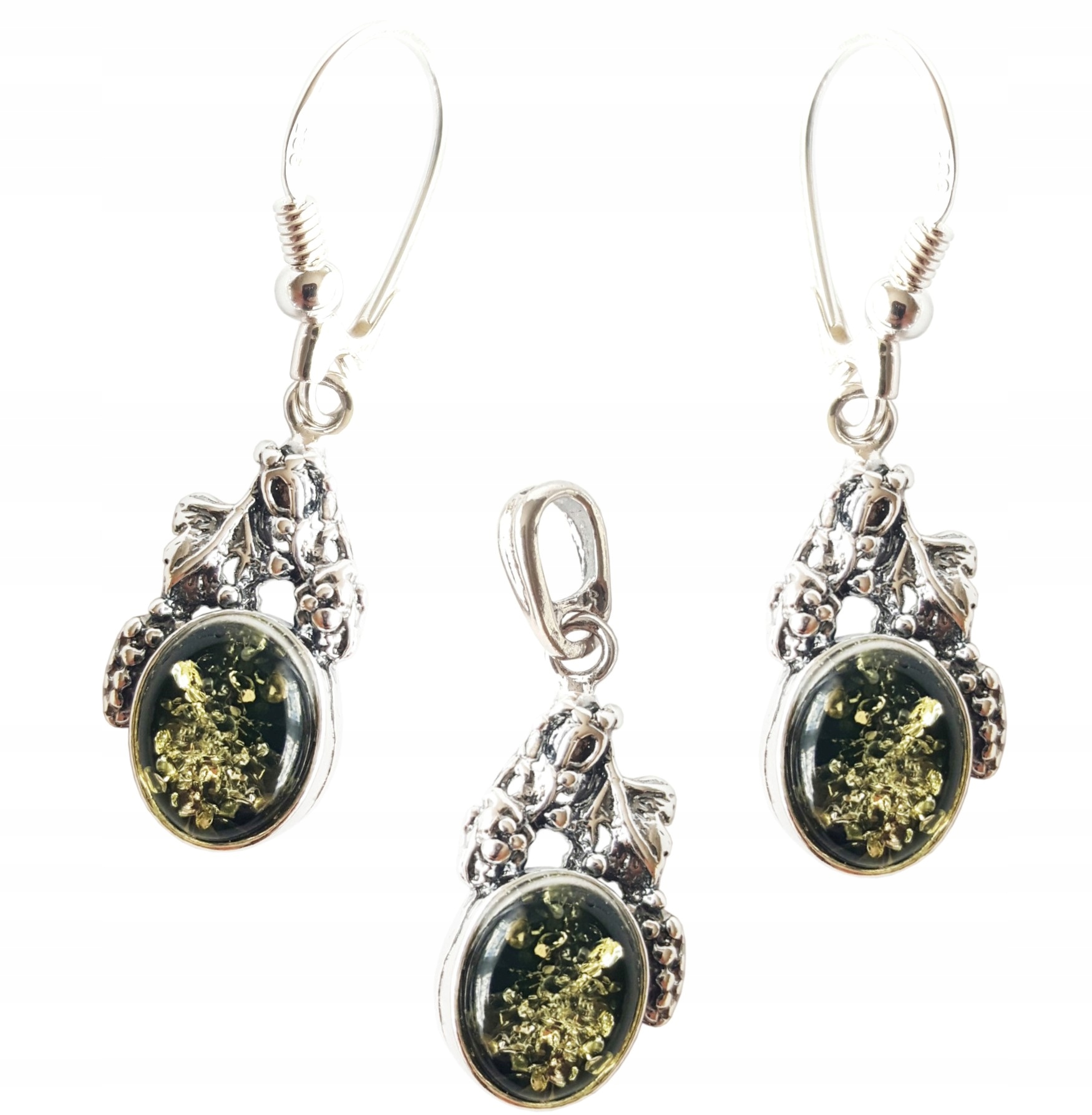 Oferujemy Państwu wyjątkowy KOMPLET srebrny z bursztynem – KOLCZYKI + ZAWIESZKA.