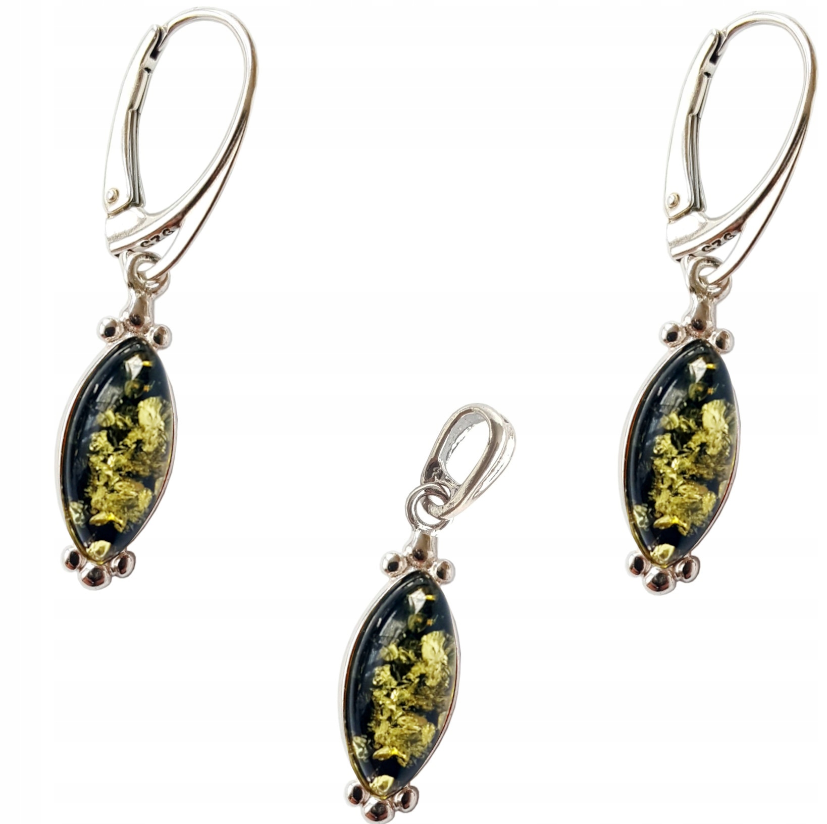 Oferujemy Państwu wyjątkowy KOMPLET srebrny z bursztynem – KOLCZYKI + WISIOREK.