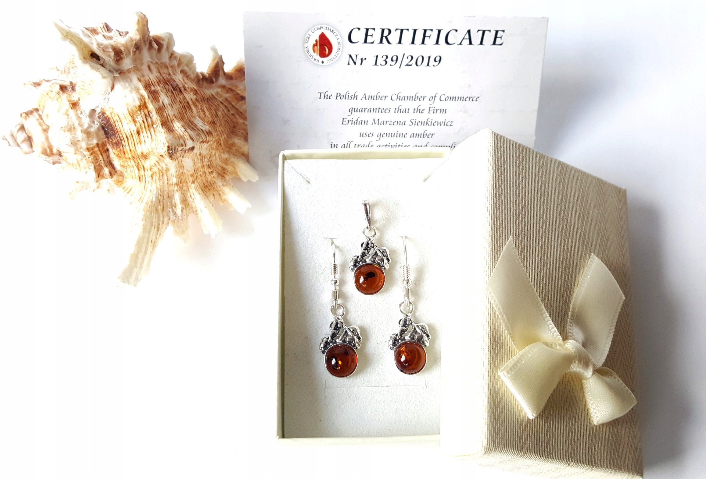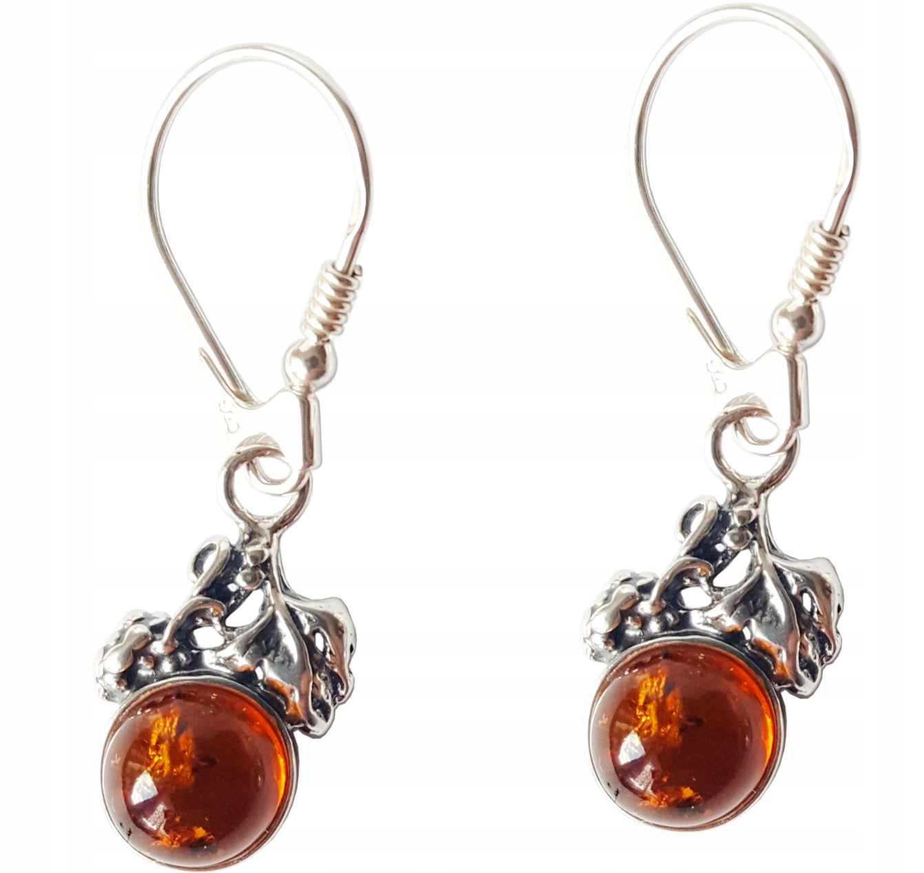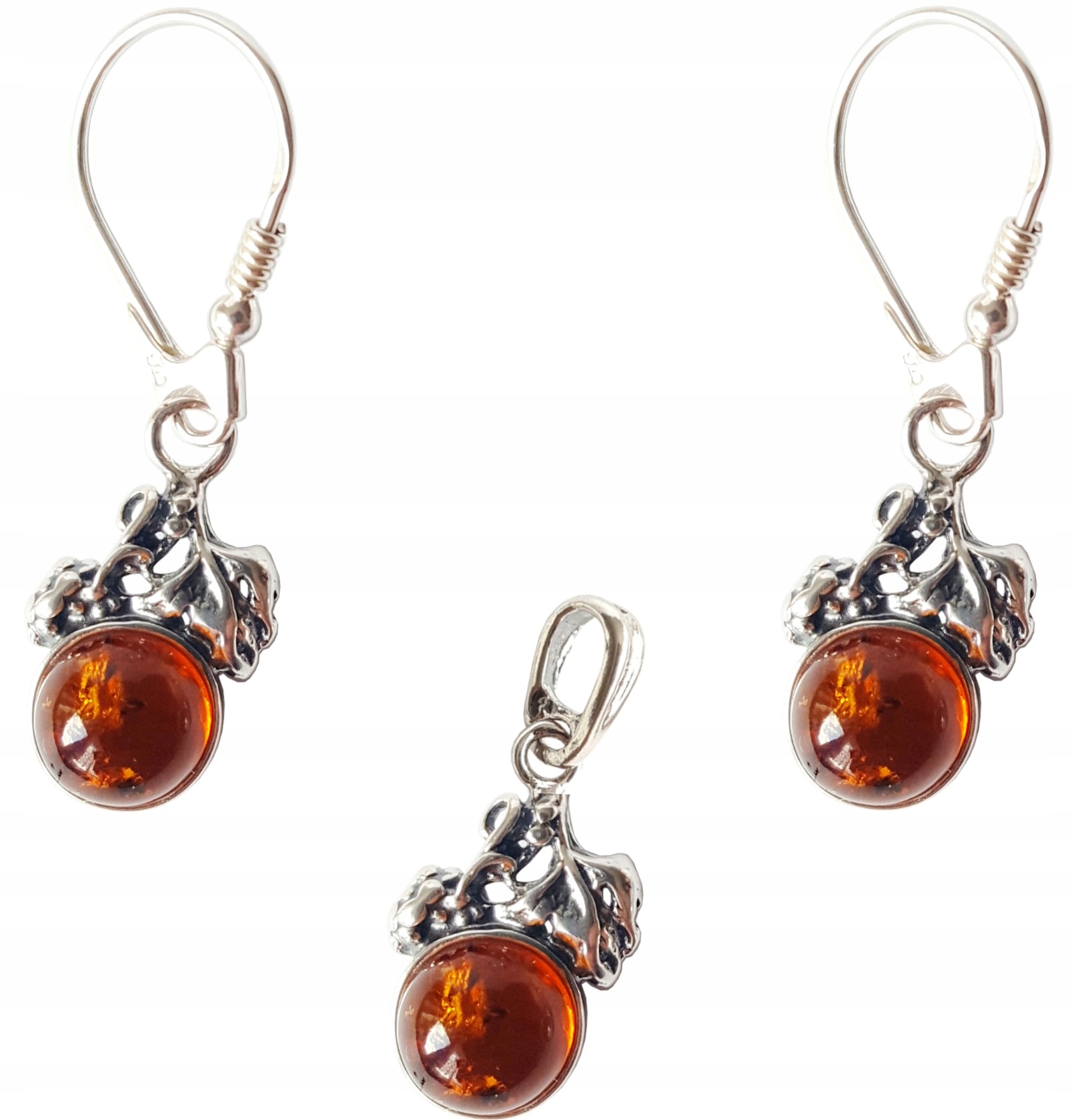 Oferujemy Państwu wyjątkowy KOMPLET srebrny z bursztynem – KOLCZYKI + WISIOREK.