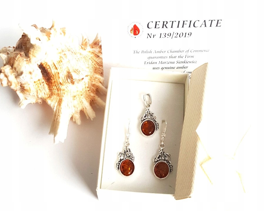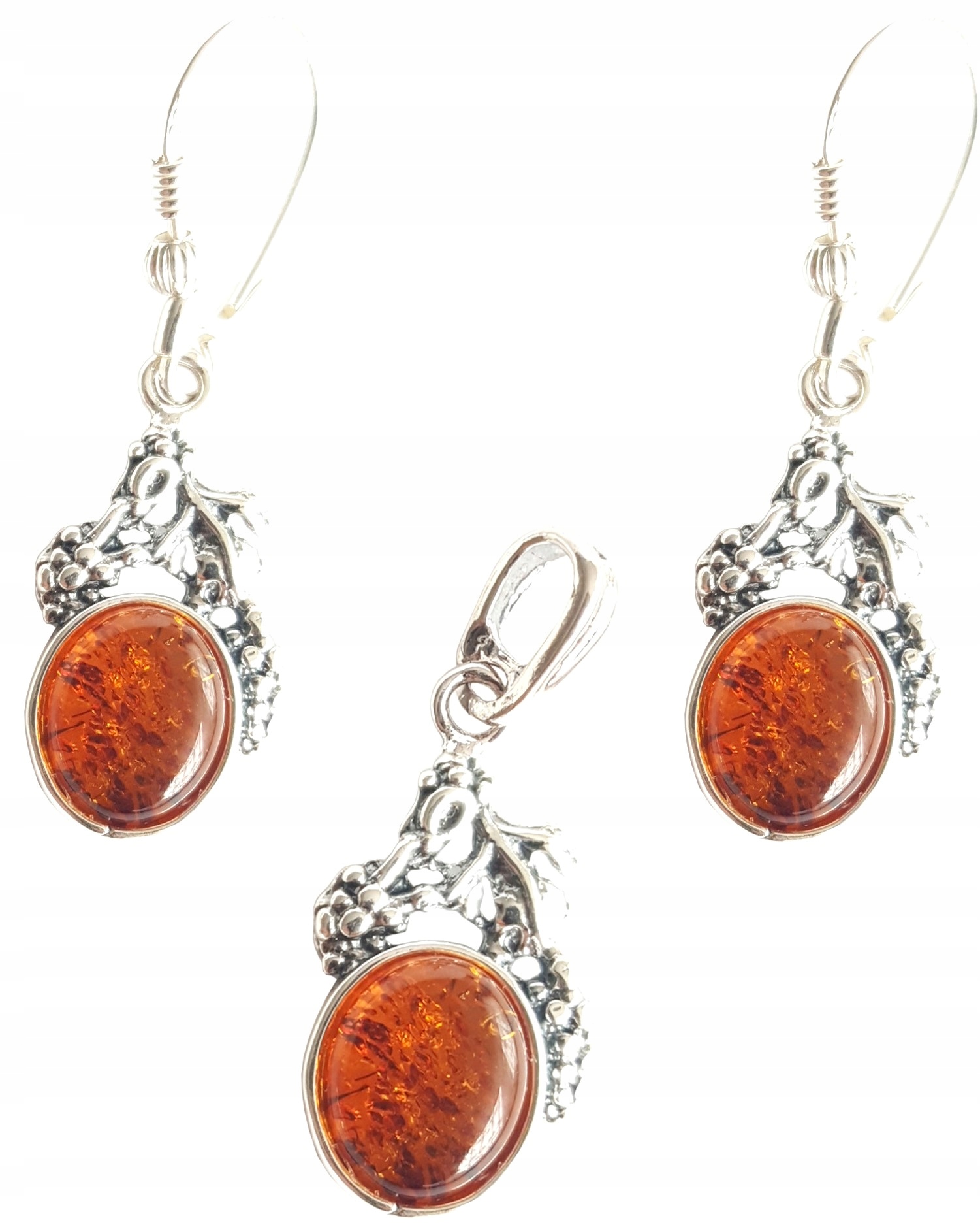 Oferujemy Państwu wyjątkowy KOMPLET srebrny z bursztynem – KOLCZYKI + ZAWIESZKA.