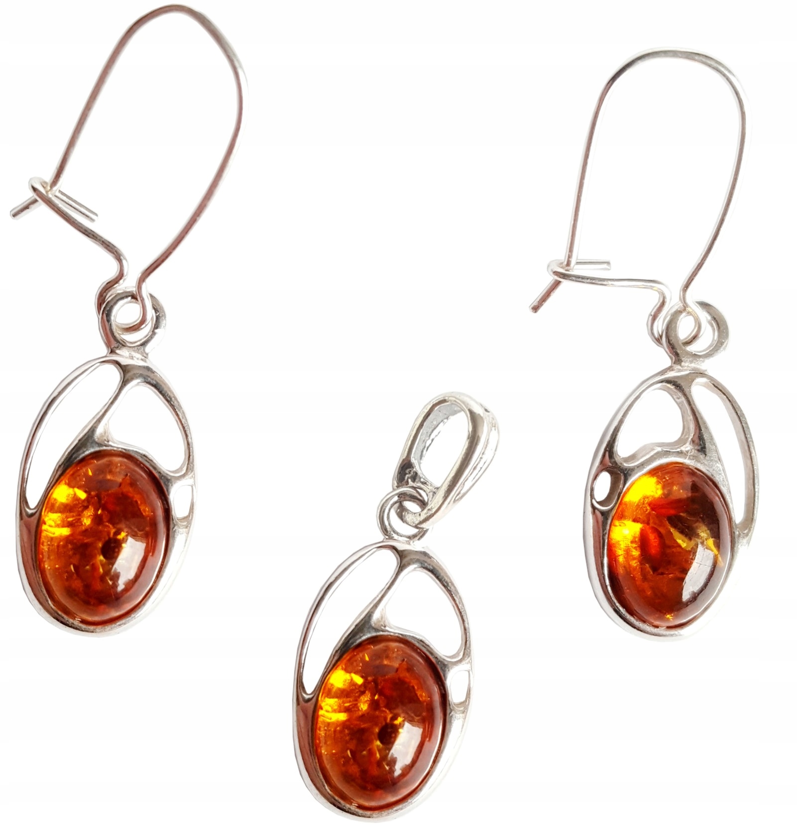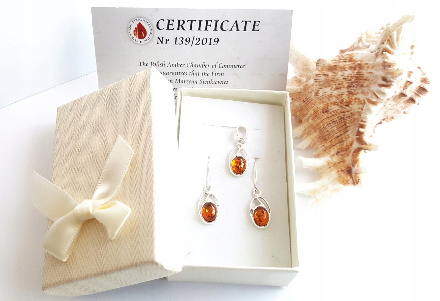 KOMPLET srebrny z BURSZTYNEM wisiorek KOLCZYKI +certyfikat