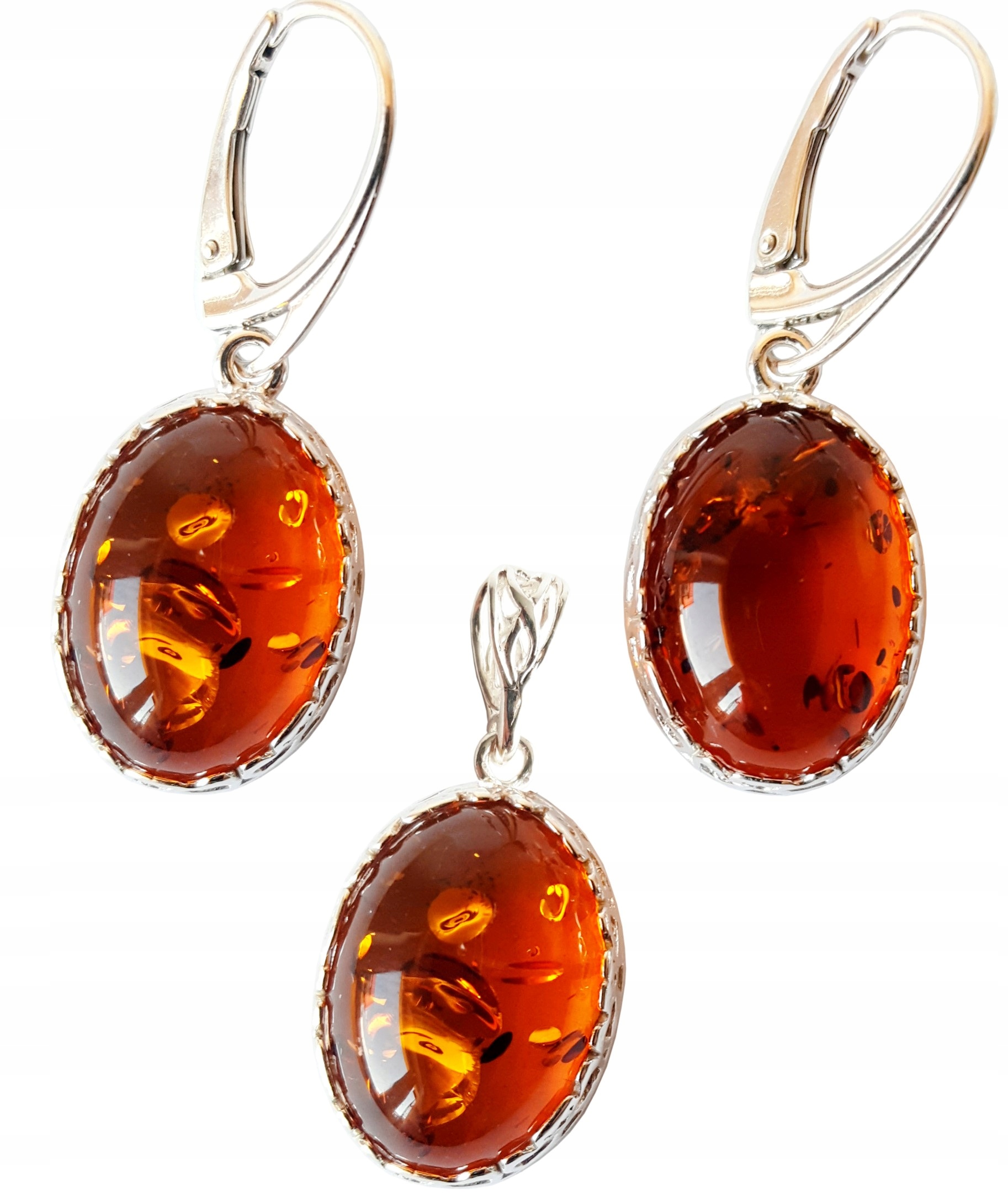 Oferujemy Państwu wyjątkowy KOMPLET srebrny z bursztynem – KOLCZYKI + WISIOREK.
