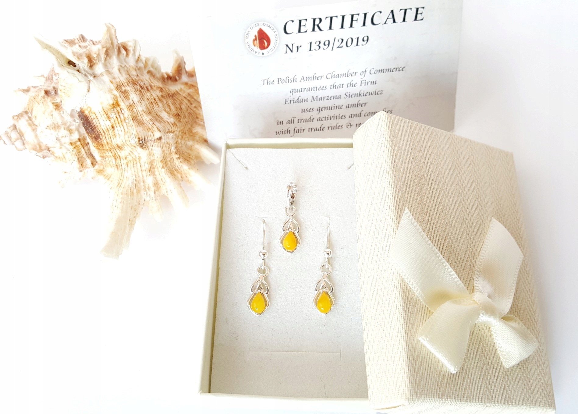 Oferujemy Państwu wyjątkowy KOMPLET srebrny z bursztynem – KOLCZYKI + WISIOREK.
