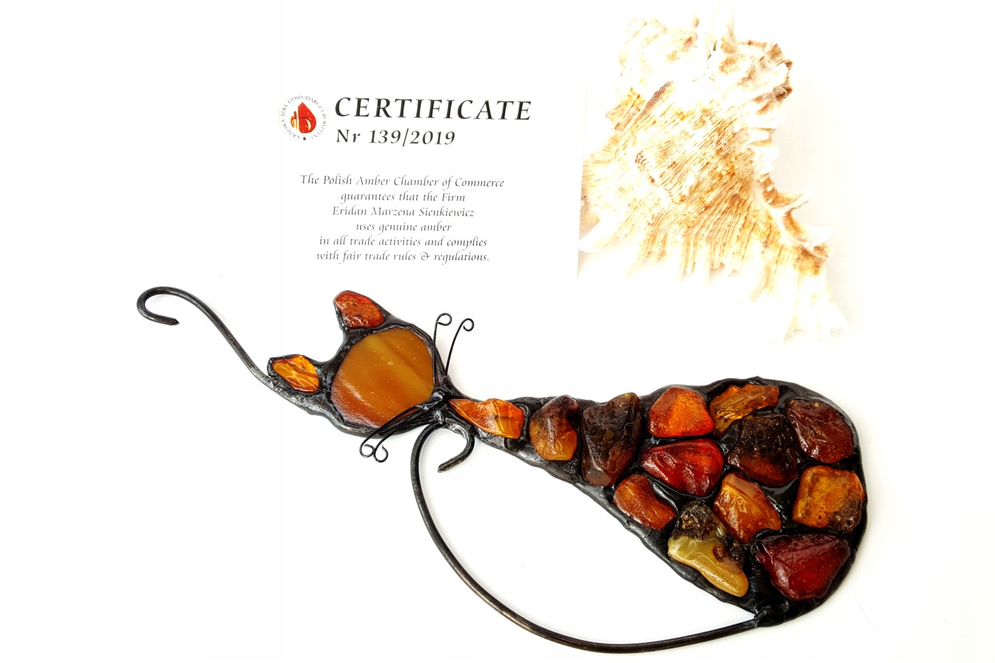 Odcień elementów bursztynowych jest różnobarwny, z odcieniami klasycznego brązu. Bursztyn został połączony metodą witrażową dzięki cynie.