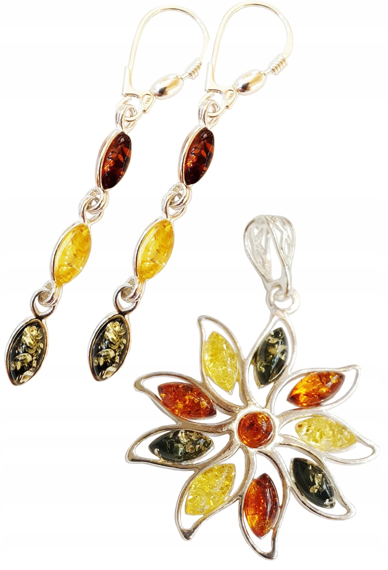 Mega KOMPLET srebrny z bursztynem – długie KOLCZYKI + ZAWIESZKA + BRANSOLETKA Prawdziwy BURSZTYN (wielokolorowy) SREBRO 925