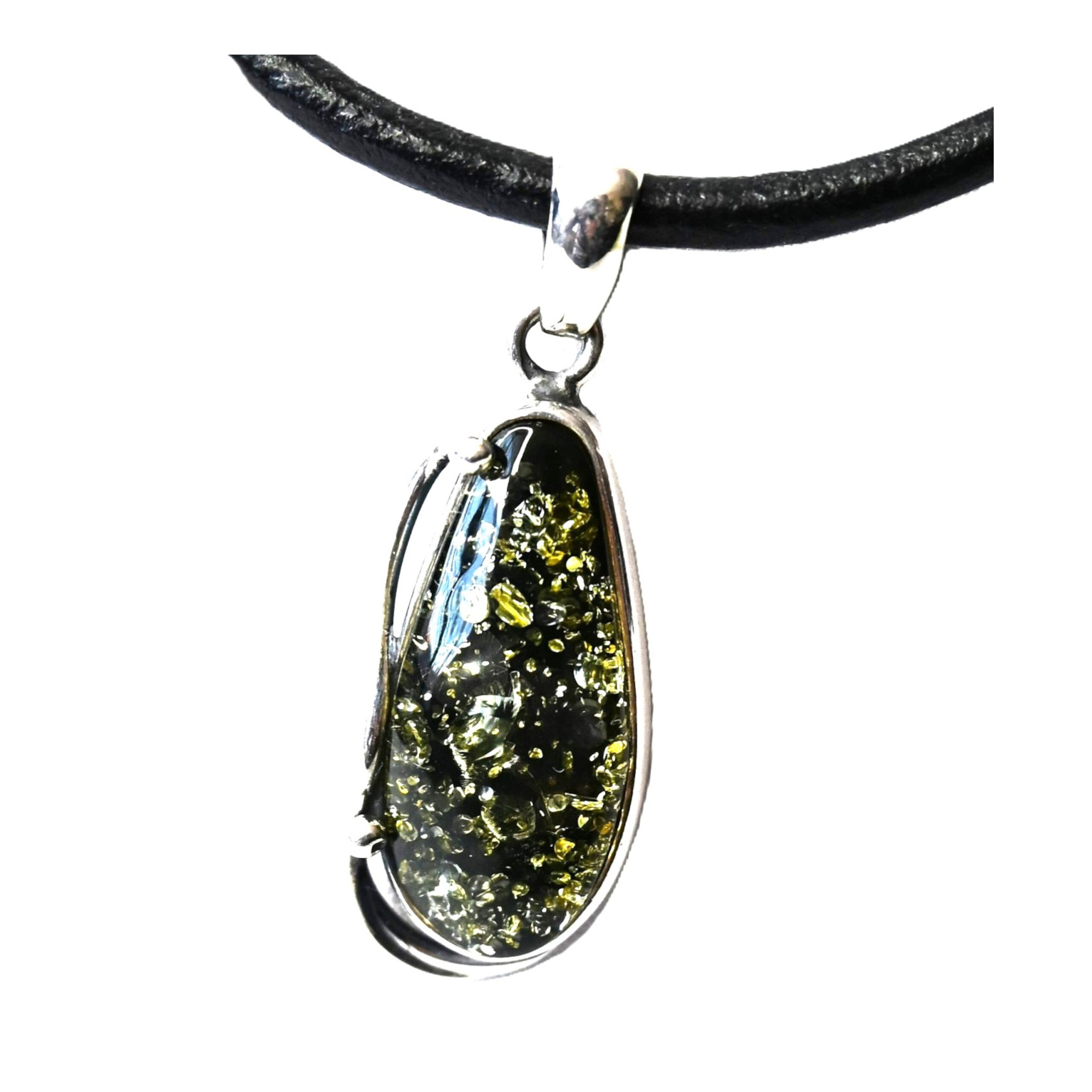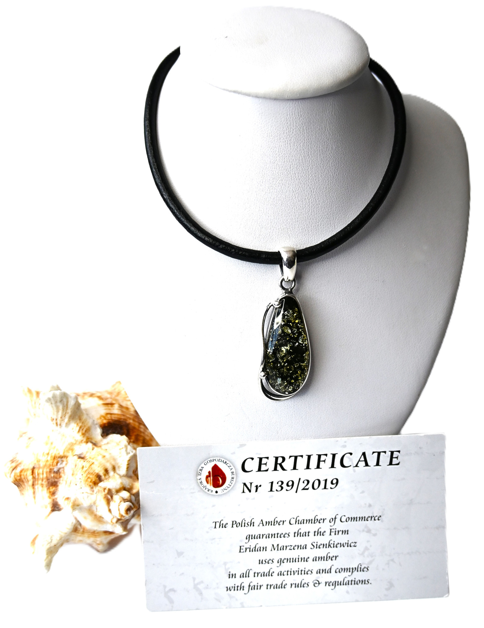 Oferujemy Państwu piękny i wyjątkowy WISIOR srebrny z zielonym BURSZTYNEM i rzemieniem w komplecie.
