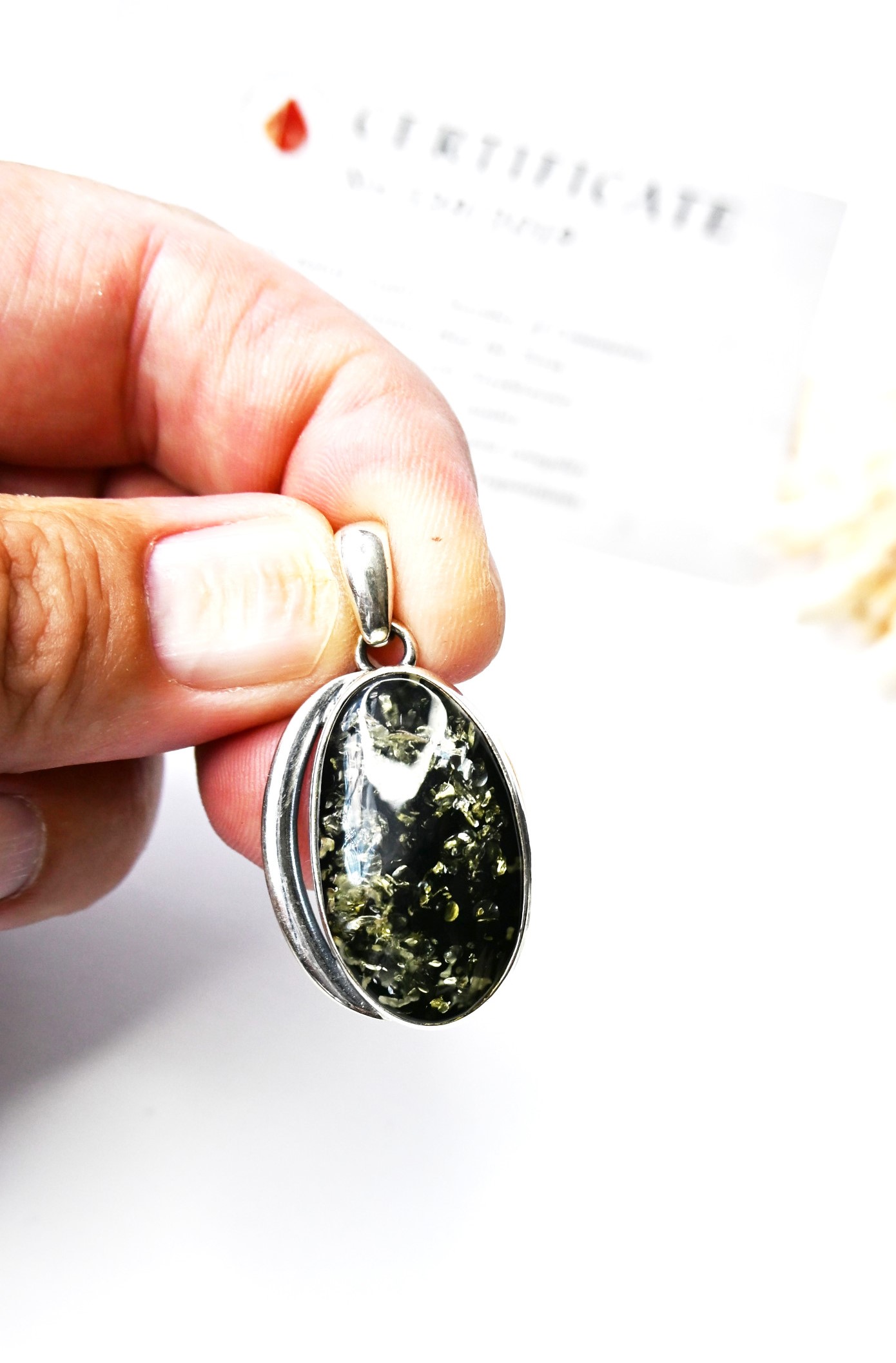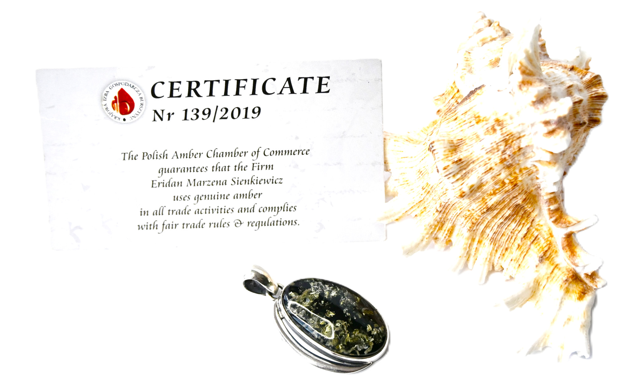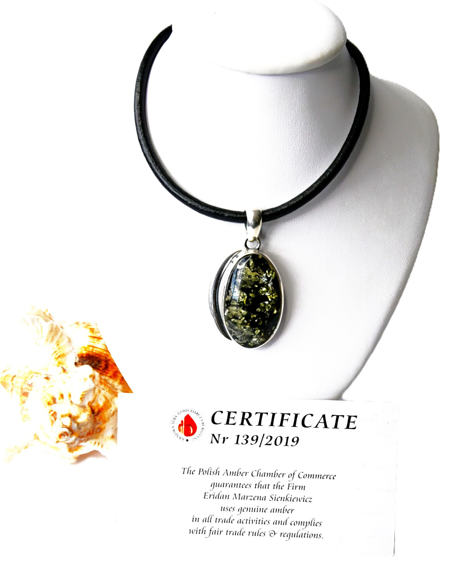 WISIOR srebrny z zielonym BURSZTYNEM na PREZENT + rzemień CERTYFIKAT