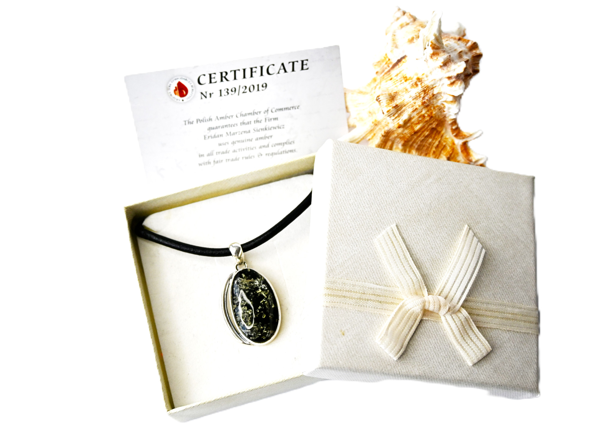 Kupując Nasz srebrny wisior z bursztynem i rzemieniem możecie być Państwo pewni, że zostanie on zapakowany w bardzo ładne pudełko jubilerskie. Zupełnie za darmo. Pudełka wybieramy losowo, zawsze kierując się tym, aby idealnie pasował do wybranego przez Państwa wisiora. Dodatkowo otrzymacie Państwo od Nas certyfikat potwierdzający autentyczność wyrobu.