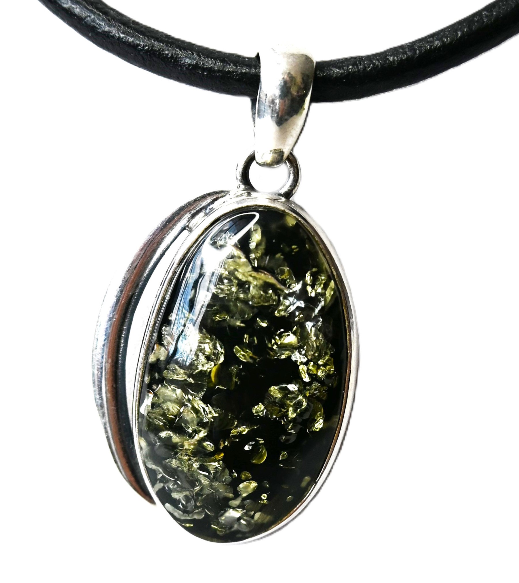 Oferujemy Państwu piękny i wyjątkowy WISIOR srebrny z zielonym BURSZTYNEM i rzemieniem w komplecie.