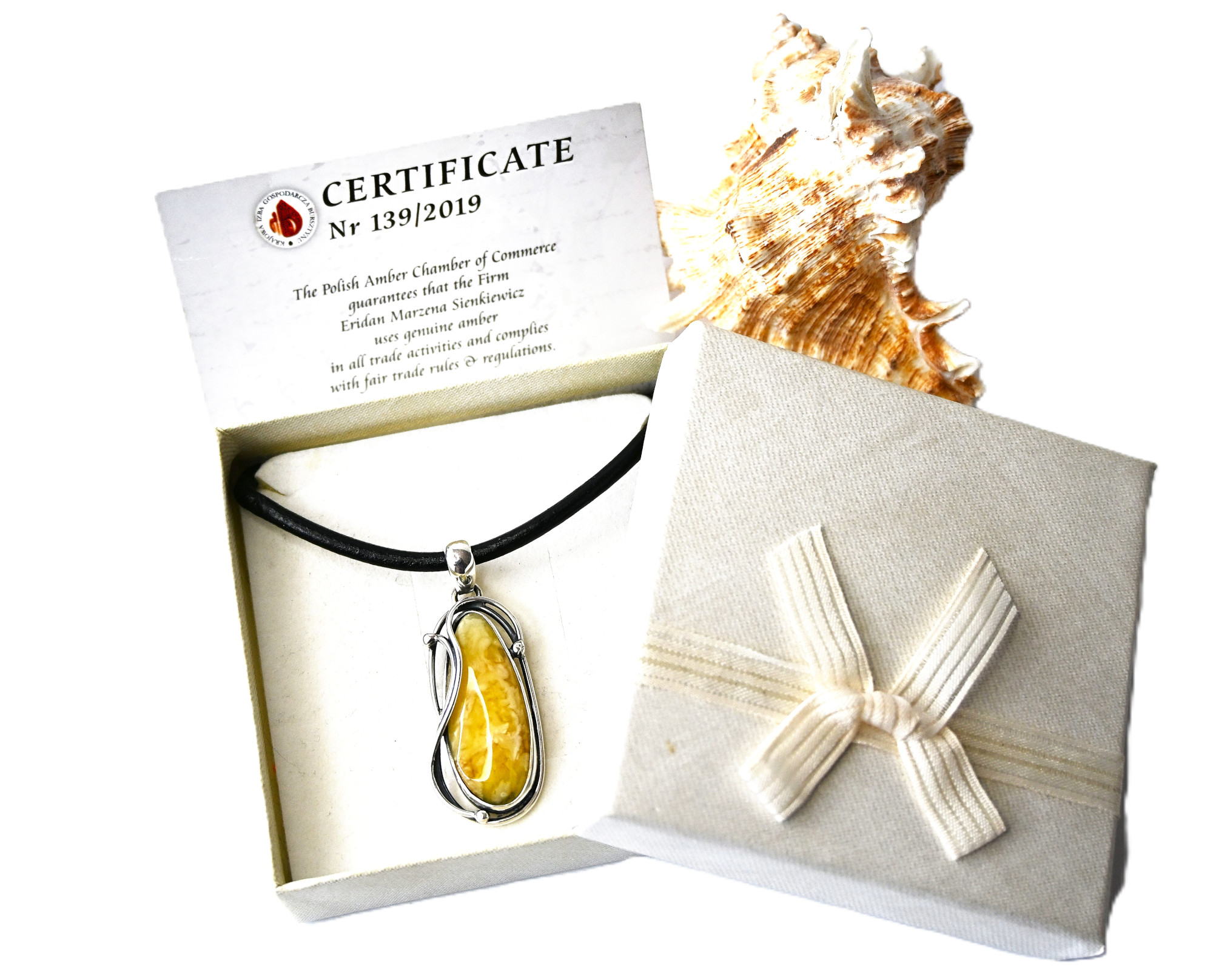 Kupując Nasz srebrny wisior z bursztynem i rzemieniem możecie być Państwo pewni, że zostanie on zapakowany w bardzo ładne pudełko jubilerskie. Zupełnie za darmo. Pudełka wybieramy losowo, zawsze kierując się tym, aby idealnie pasował do wybranego przez Państwa wisiora. Dodatkowo otrzymacie Państwo od Nas certyfikat potwierdzający autentyczność wyrobu.