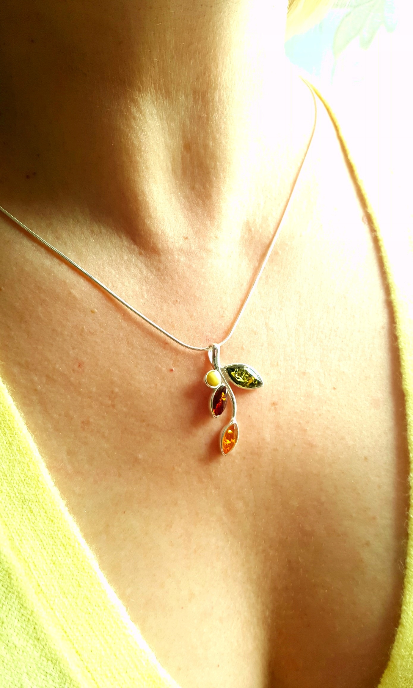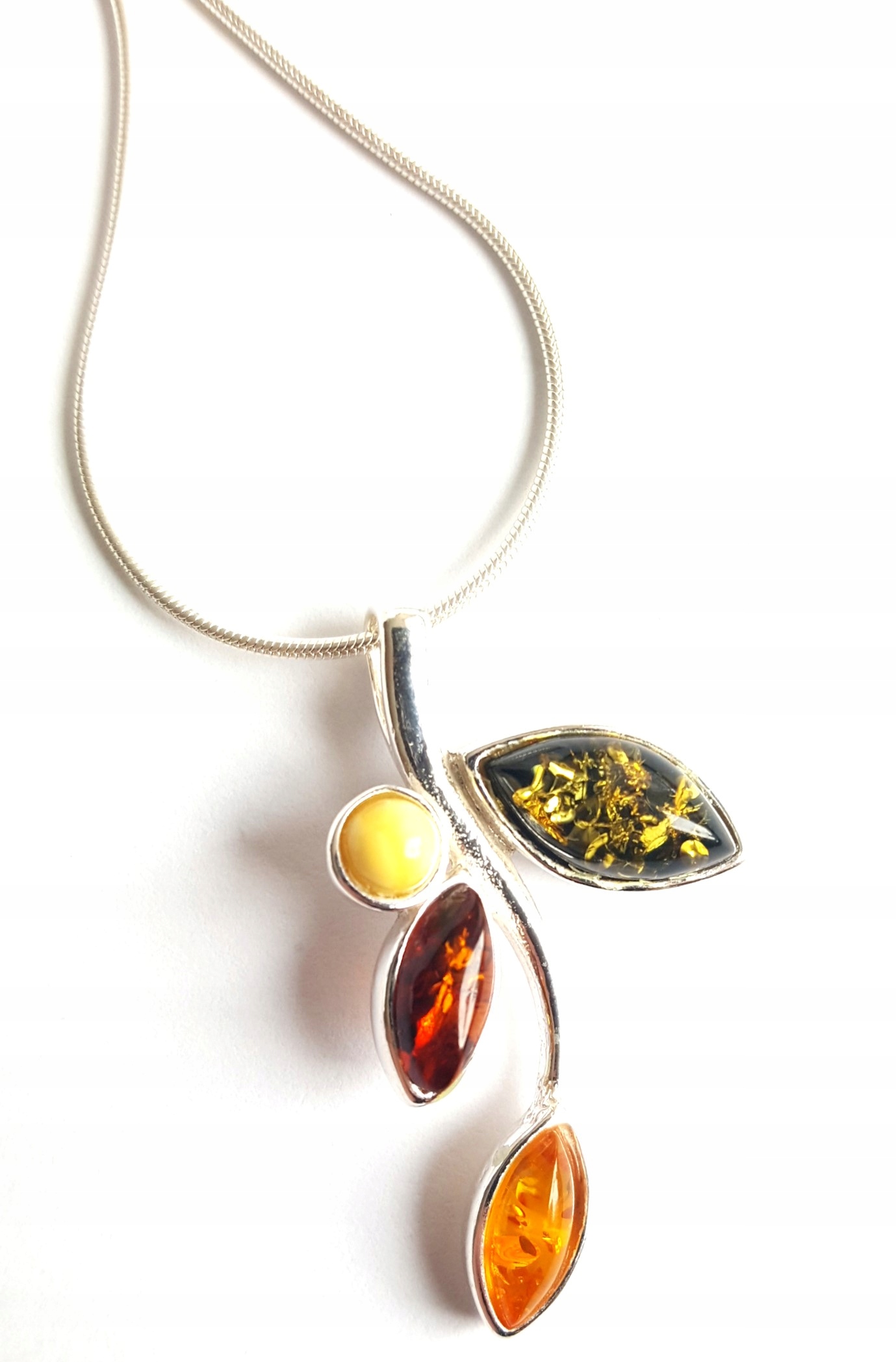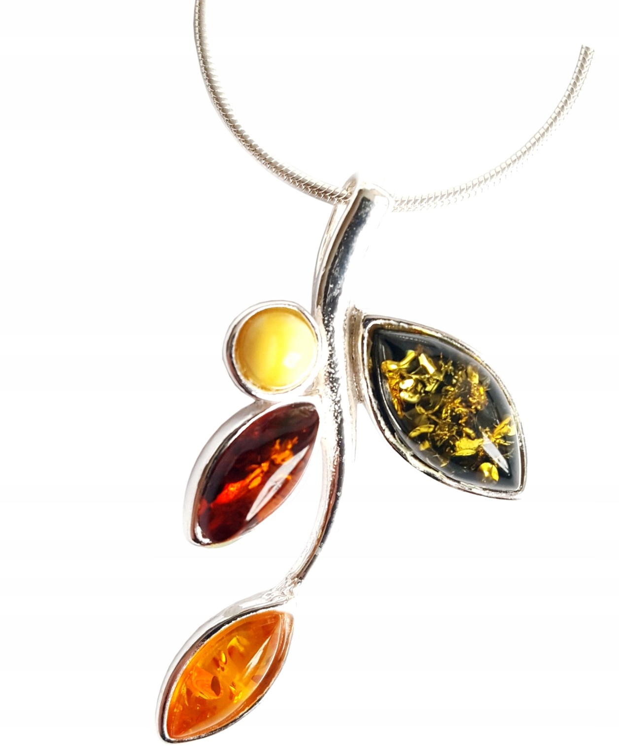 Oferujemy Państwu piękny i delikatny WISIOREK srebrny z prawdziwym kolorowym BURSZTYNEM wraz ze srebrnym ŁAŃCUSZKIEM pr. 925 w komplecie.