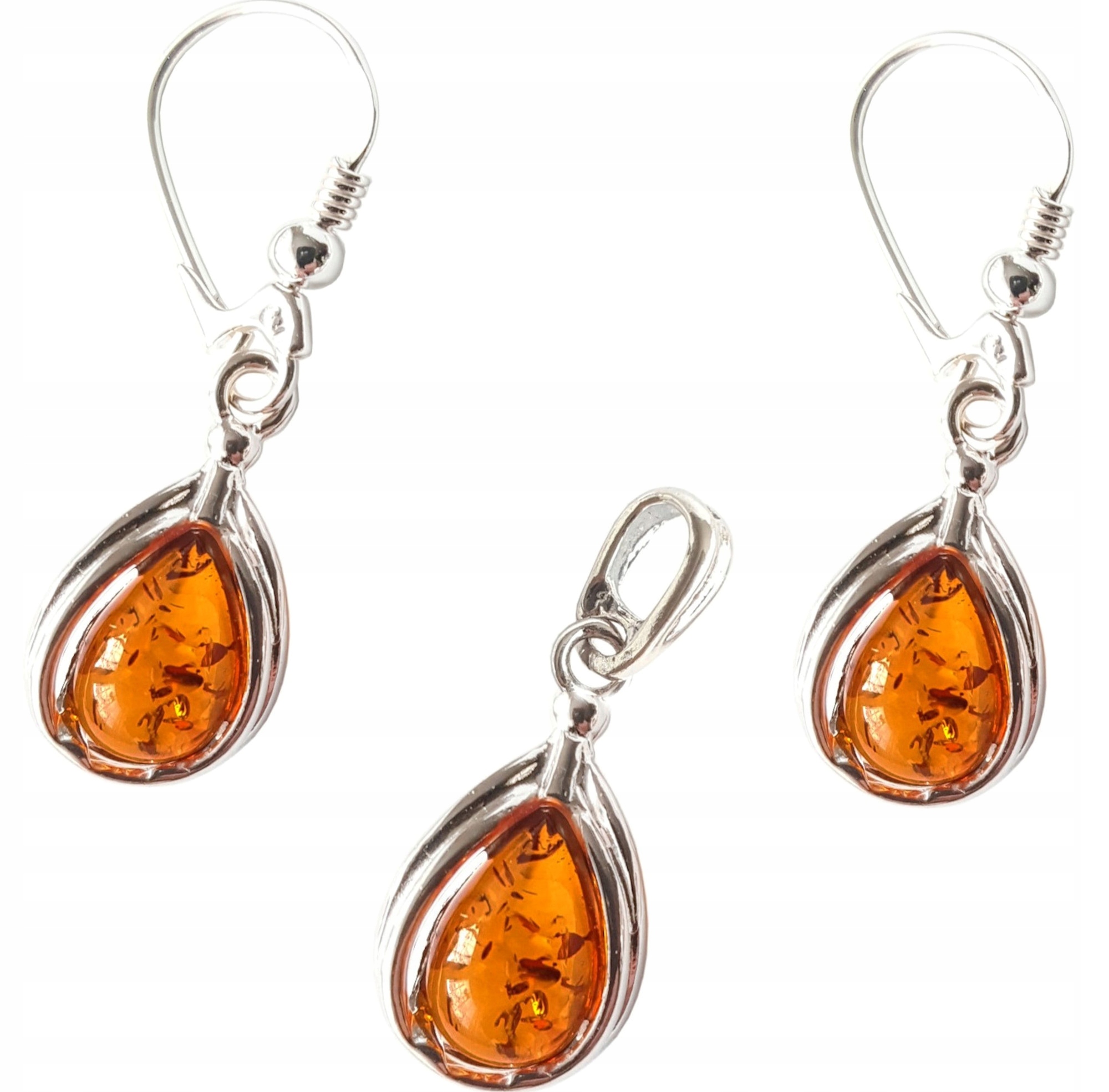 Oferujemy Państwu wyjątkowy KOMPLET srebrny z bursztynem – KOLCZYKI + WISIOREK.