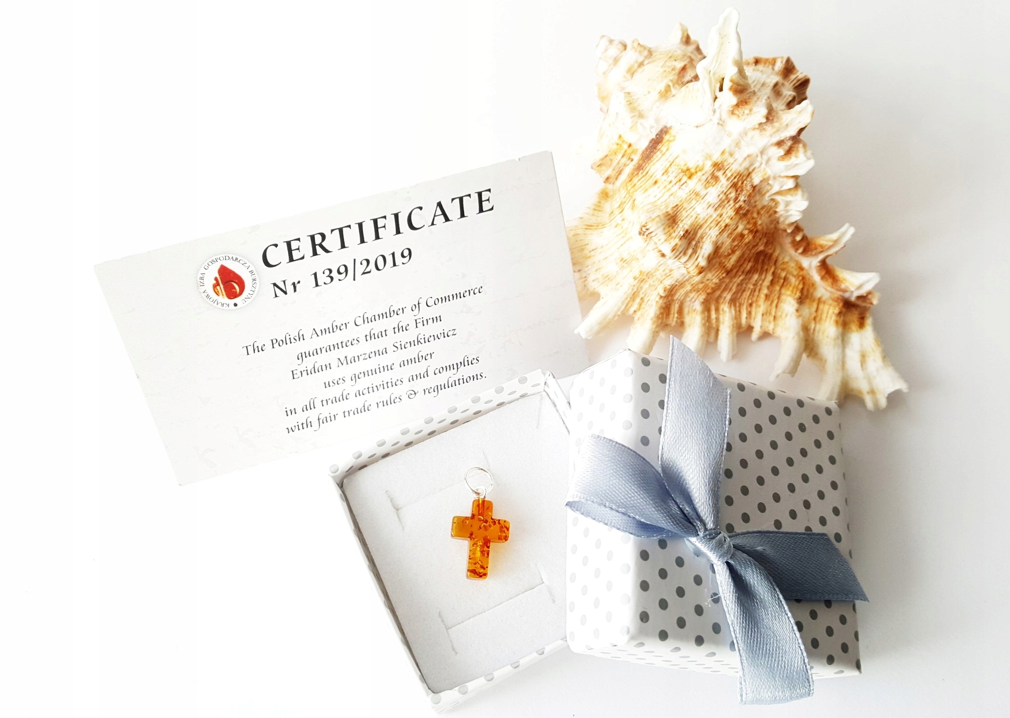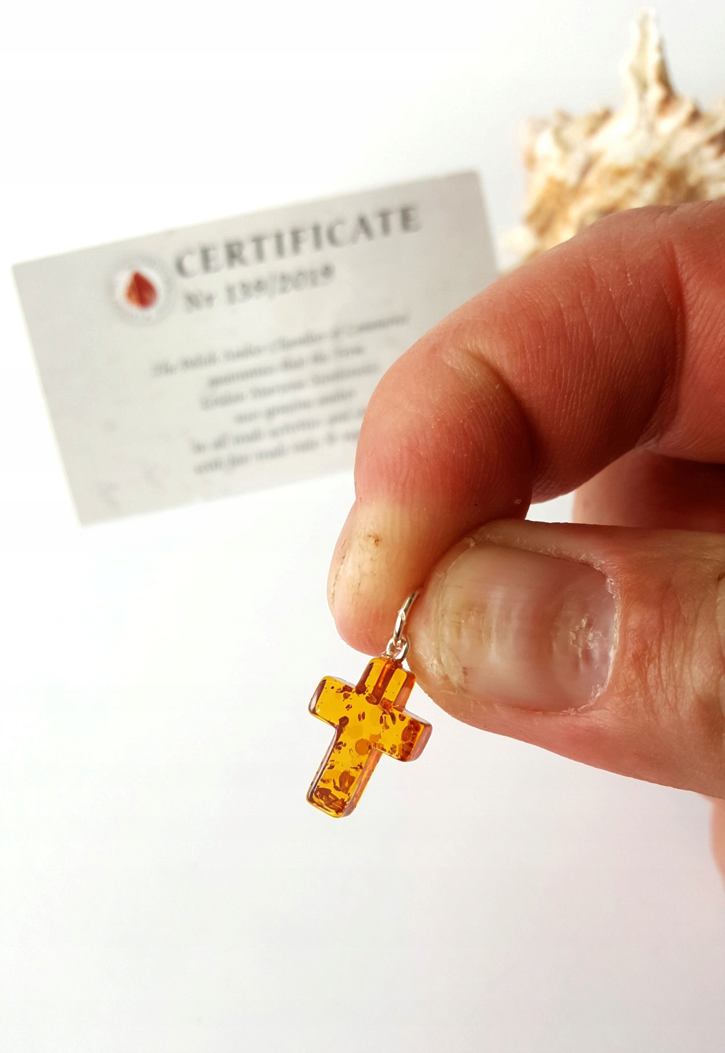 Oferowany KRZYŻYK BURSZTYNOWY ze srebrną zawieszką jest zupełnie nowy i pochodzi od lokalnych jubilerów-artystów z Gdańska oraz okolic, zajmujących się na co dzień wzornictwem w bursztynie.