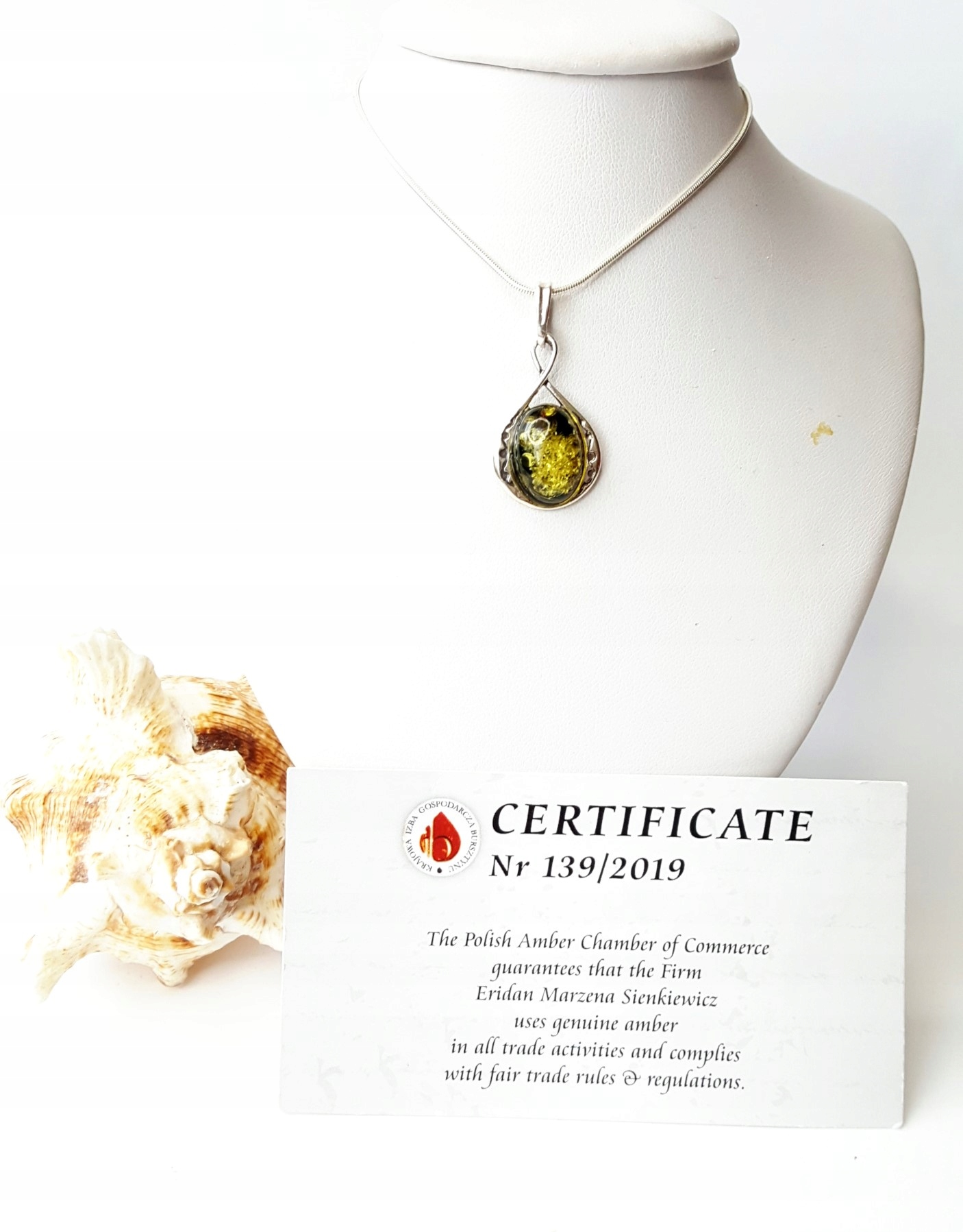 Oferujemy Państwu piękny i delikatny WISIOREK z zielonym BURSZTYNEM i delikatnym ŁAŃCUSZKIEM srebrnym w komplecie.