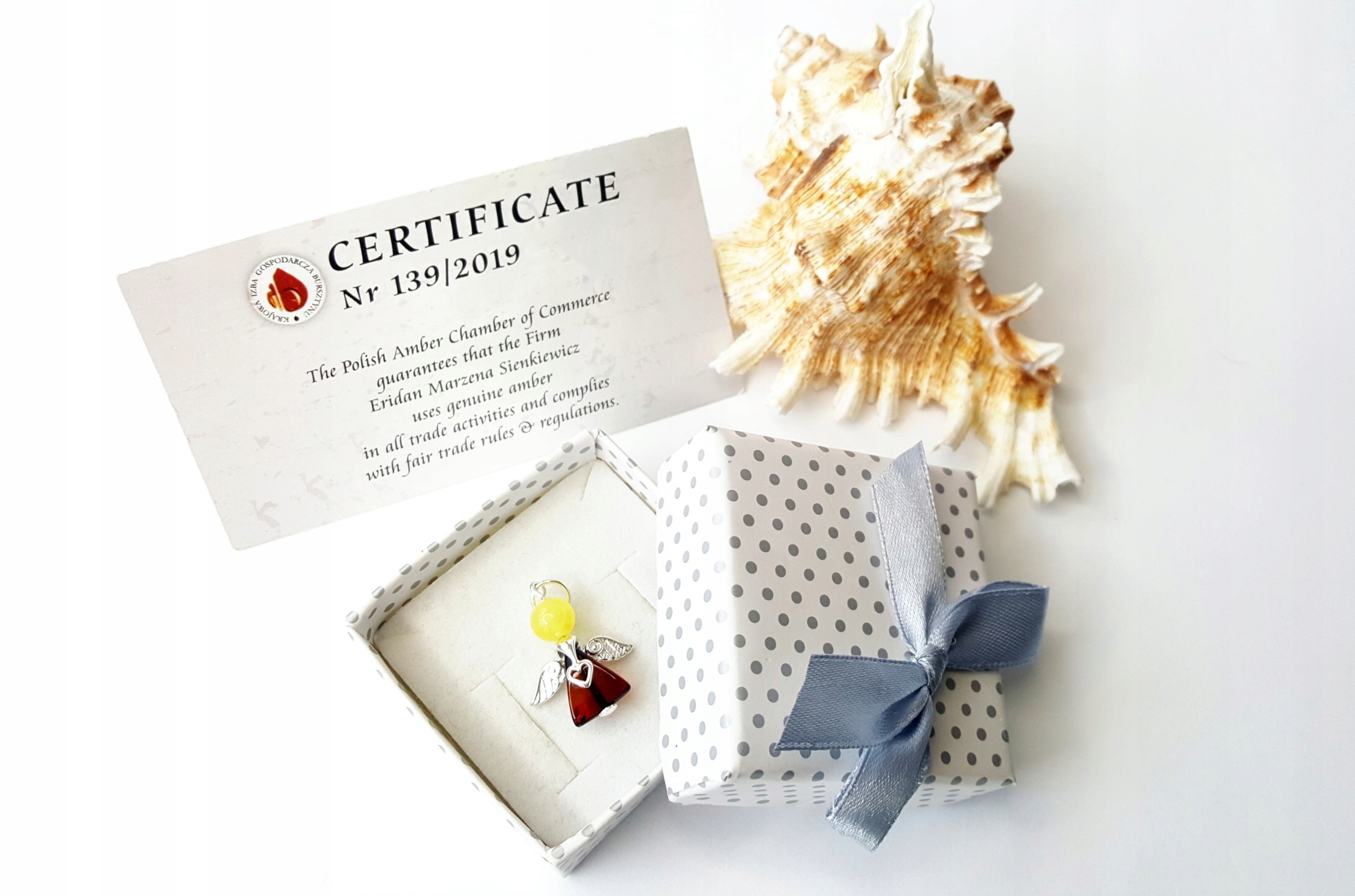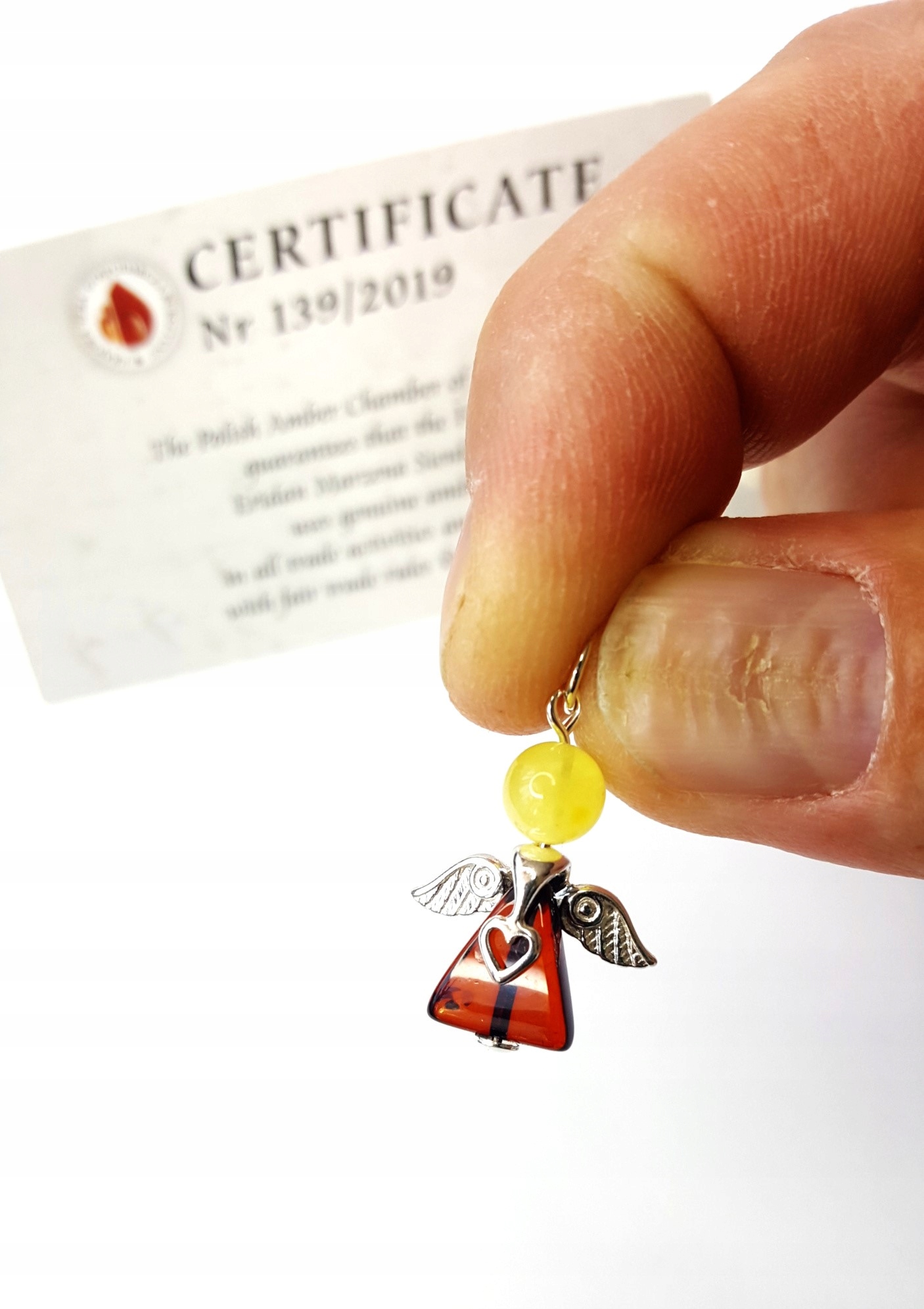 WISIOREK zawieszka ANIOŁEK srebrny BURSZTYN serce CERTYFIKAT