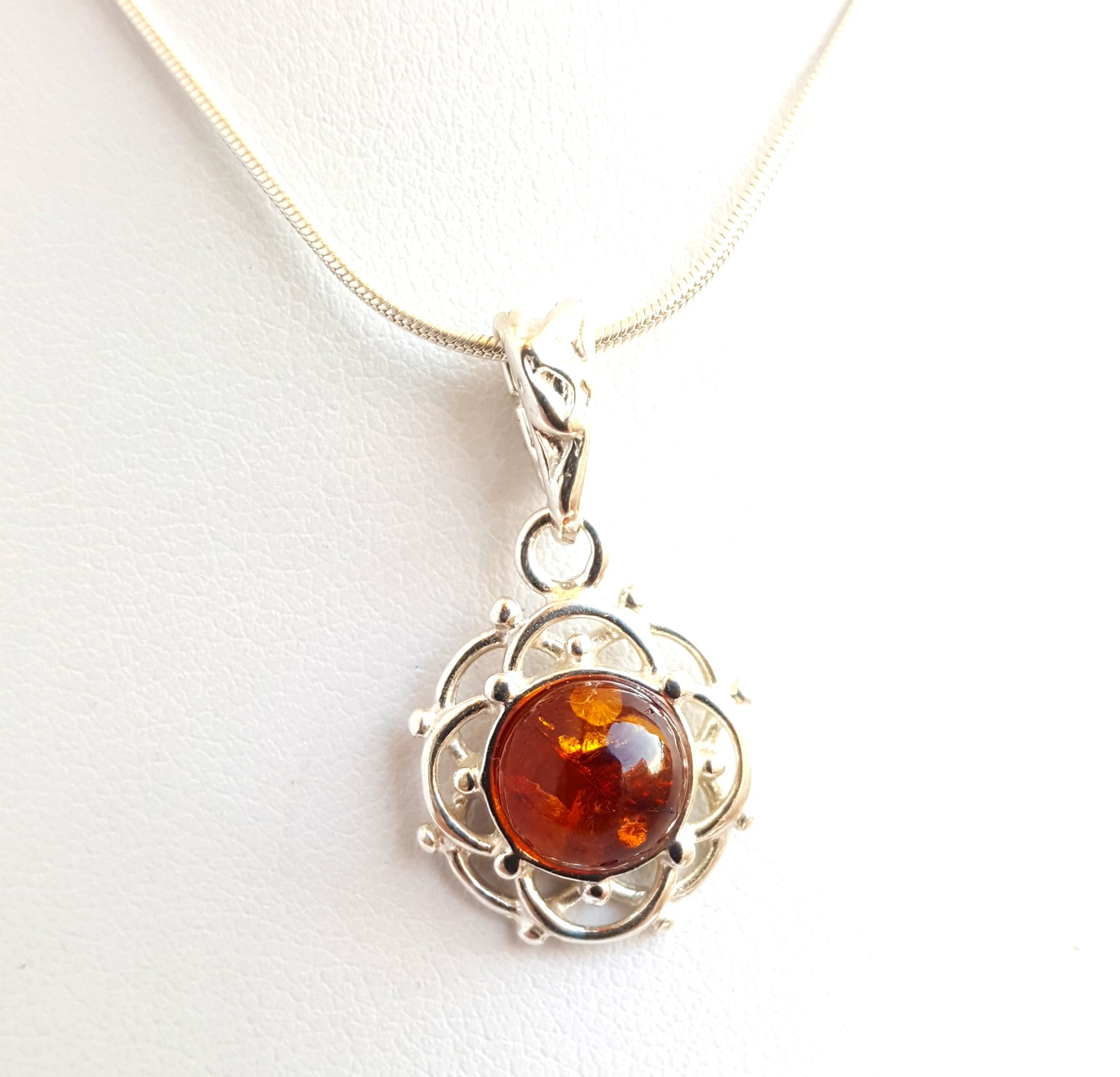 Oferujemy Państwu piękny WISIOREK z brązowym BURSZTYNEM i delikatnym ŁAŃCUSZKIEM srebrnym w komplecie.