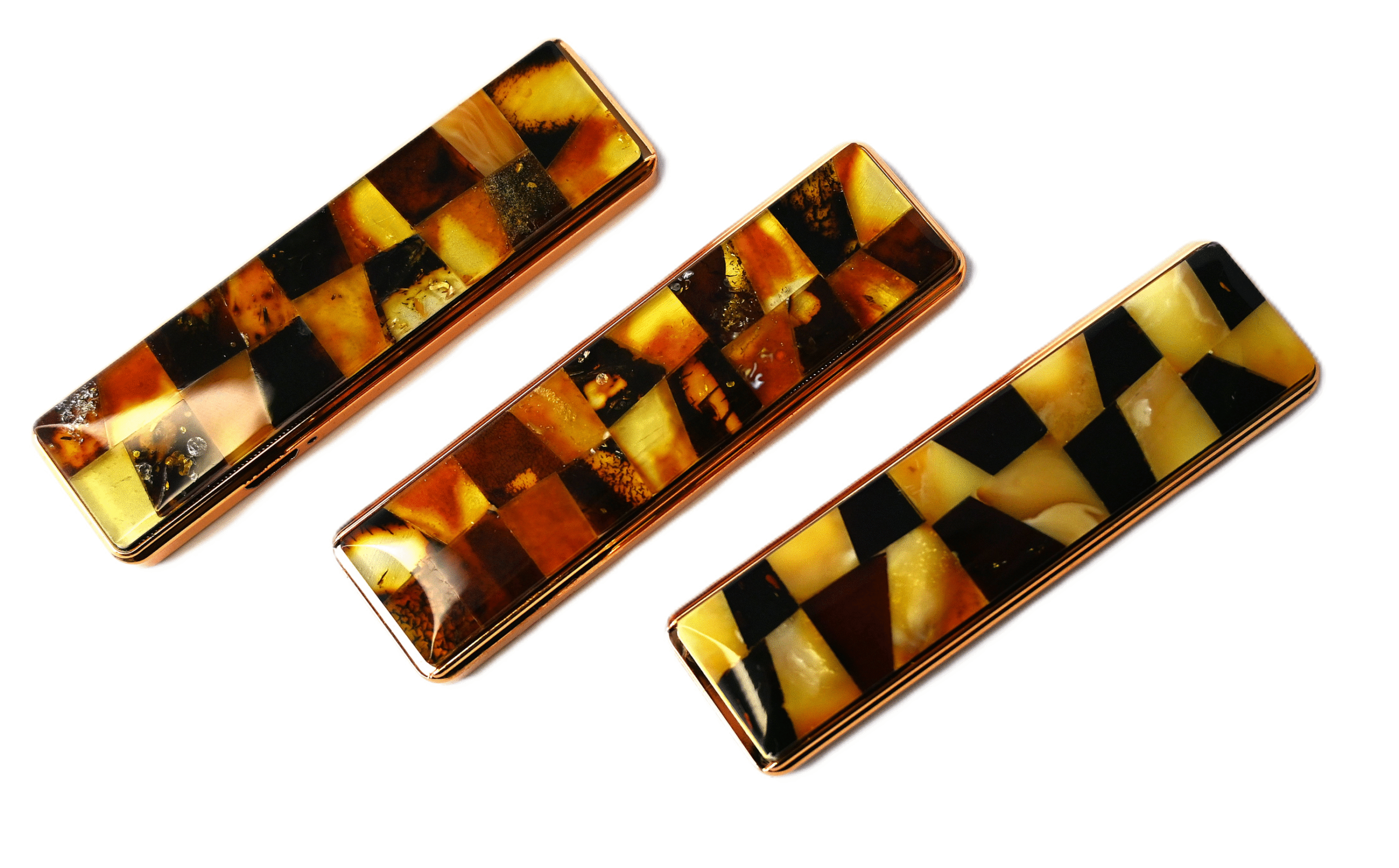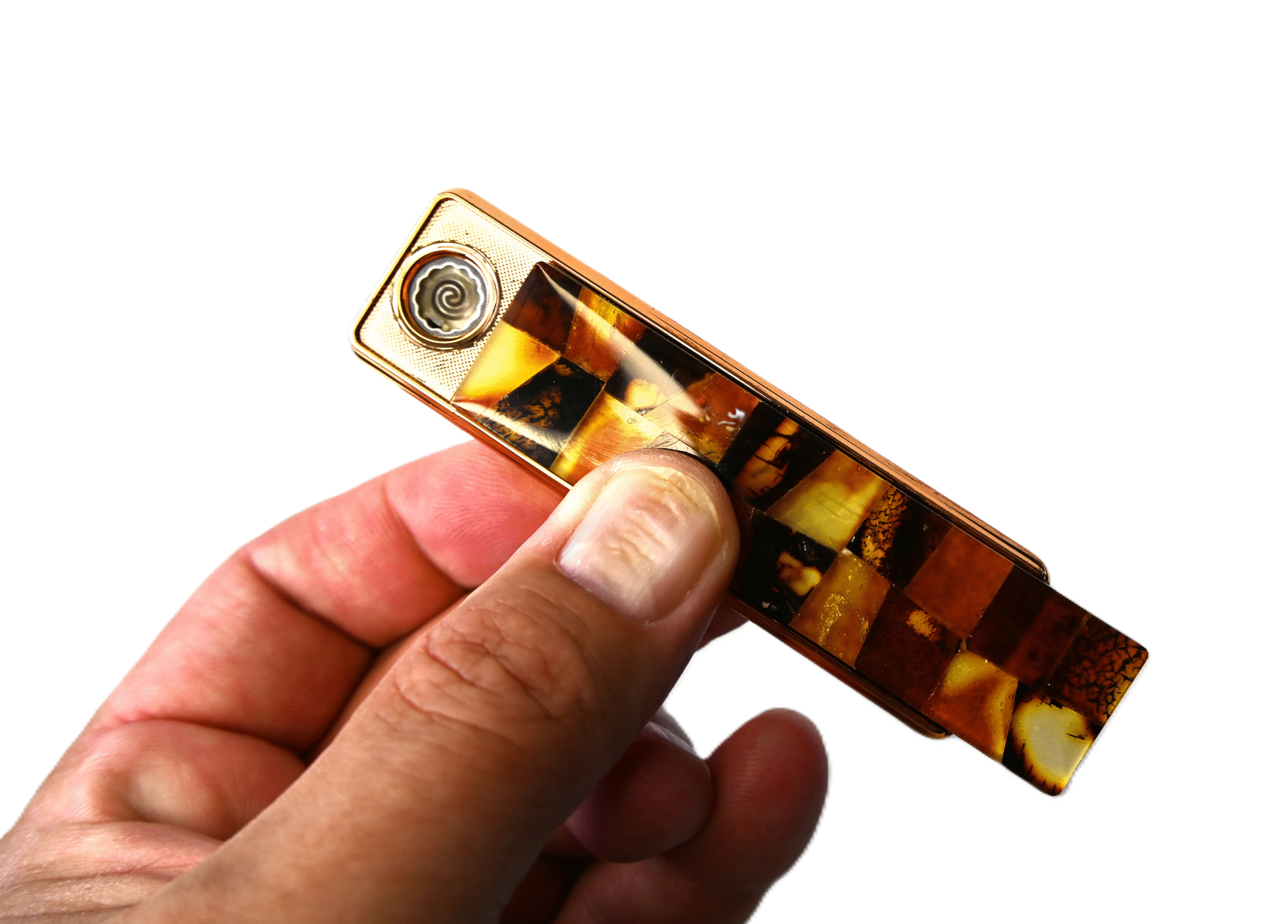 • Zapalniczka w kolorze ciemnego złota; z jednej strony dekorowana bursztynem